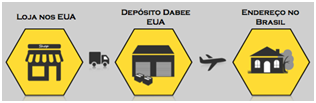 Basta acessar a página do produto desejado na Dabee e clicar em “comprar”. Caso o produto escolhido não tenha preço, basta clicar em “Cotação Grátis”. Após adicionar o produto ao seu carrinho, selecione se deseja pagar os impostos antes ou após o produto chegar no Brasil. Você também pode optar por receber o produto em um endereço nos EUA (como hotel ou casa de amigo). Por fim, insira o endereço de entrega, escolha o método de pagamento (cartão de crédito ou Paypal) e finalize sua compra. Pronto, agora é só aguardar! O produto solicitado será enviado pela loja estrangeira ao depósito da Dabee nos EUA, para depois ser enviado pela Dabee ao endereço de entrega no Brasil. Veja como funciona: