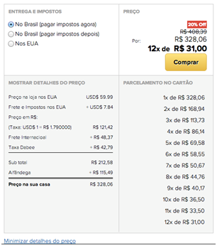 Veja abaixo um exemplo:Mesmo com os custos para a importação, a grande vantagem é poder comprar facilmente qualquer produto que está a venda apenas em outro País, sem ter de sair de casa. E com segurança de que o preço final é aquele, com seguro de entrega, facilidade de pagamento (parcelado em até 12x) no seu cartão nacional, com a tradução em português e ainda com atendimento personalizado no Brasil. Agora comprar na internet produtos de outros países ficou fácil, rápido e seguro!