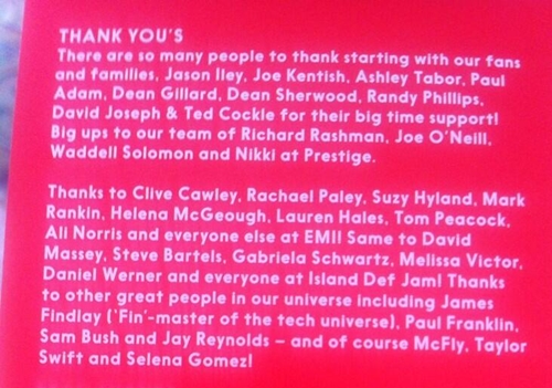 “Obrigada a outras pessoas em nosso universo, incluindo James Findlay (‘Fin’ – rei do universo tecnológico), Paul Franklin, Sam Bush e Jay Reynolds. E, é claro, McFly, Taylor Swift e Selena Gomez!”