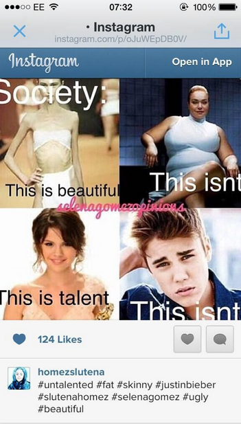 Uma hater da Selena postou uma montagem um tanto quanto maldosa e irônica no Instagram, que coloca a magreza extrema como algo bonito para a sociedade, e pessoas com mais peso como algo feio. Também diz que Selena tem talento, e Justin Bieber não. Observe:
