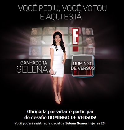 Selena Gomez saiu como vencedora do “Concurso Versus” que o site do canal E! realizou durante a semana passada. Vamos relembrar como funcionou este concurso: Selena concorria contra Miley Cyrus, e graças aos votos dos Dreamers, ela venceu, e por isso terá um especial sobre sua vida exibido hoje, 11, às 21 horas no canal de TV por Assinatura, E!.