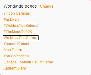 As hashtags #WeMissYouSelena (nós sentimos sua falta Selena) e We Miss Our Gomez (sentimos falta da nossa Gomez) entraram para os assuntos mais comentados da rede Twitter na tarde de hoje, terça-feira (15). Veja: